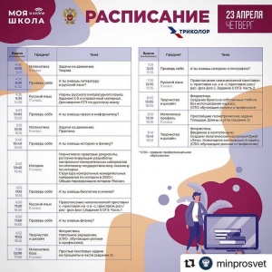 23.04.2020Министерство образования и науки Чеченской республики опубликовало на своей странице инстограмм расписание телевизионных уроков по общеобразовательным предметам для старшеклассников на телеканале «Моя школа» мультиплатформенного оператора цифровой среды «Триколор»