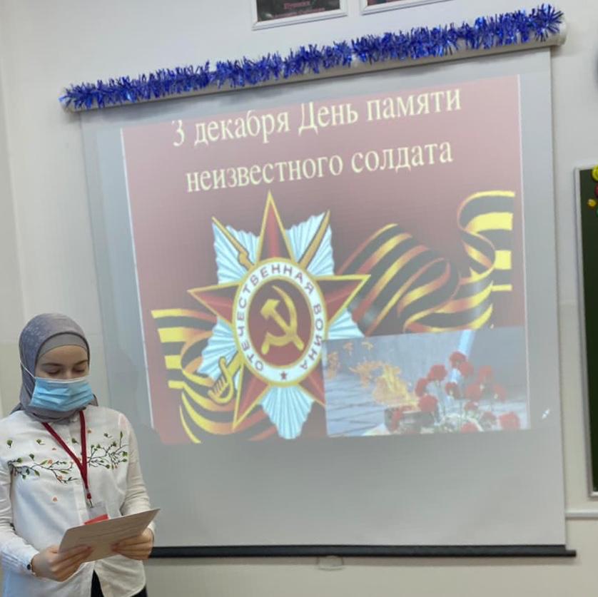 Во исполнении Письма Департамента образования Мэрии города Грозного 03.12.2020 в МБОУ «СОШ 49» Был проведён урок «Памяти и скорби неизвестного солдата»