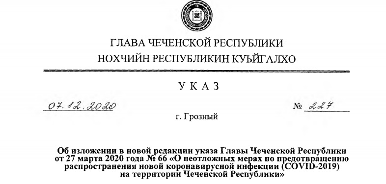 08.12.2020Об изложении в новой редакции указа Главы Чеченской Республикиот 27 марта 2020 года № 66 «О неотложных мерах по предотвращениюраспространения новой коронавирусной инфекции (COVID-2019)на территории Чеченской Республики» Ссылка