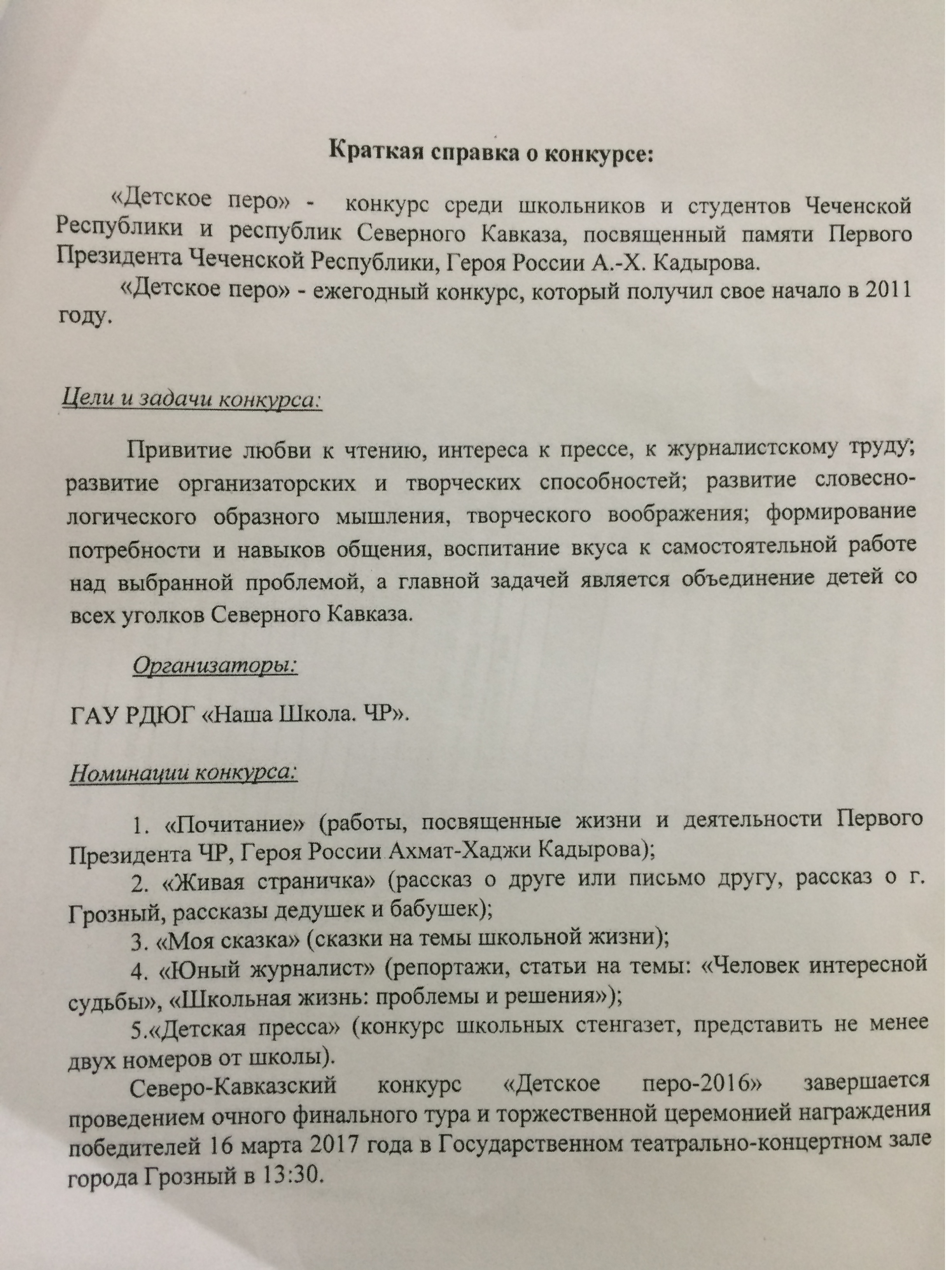 14.03.2017ГАУ «Республиканская детско-юношеская газета «Наша школа» 16.03.2017 г.в 13:30 в Государственном театрально-концертном зале города Грозного проводит торжественную церемонию награждения победителей V ежегодного Северно-Кавказкого конкурса «Детское перо – 2016», посвященного памяти Первого Президента Чеченской Республики, Героя России Ахмад-Хаджи Кадырова.