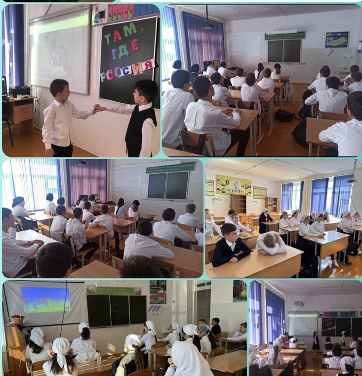 В МБОУ «СОШ №49» г. Грозного классные руководители провели в своих классах уроки в рамках проекта "Разговоры о важном."Тема занятия: «Там, где Россия".