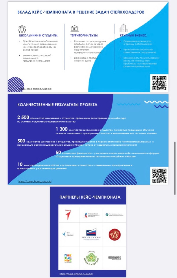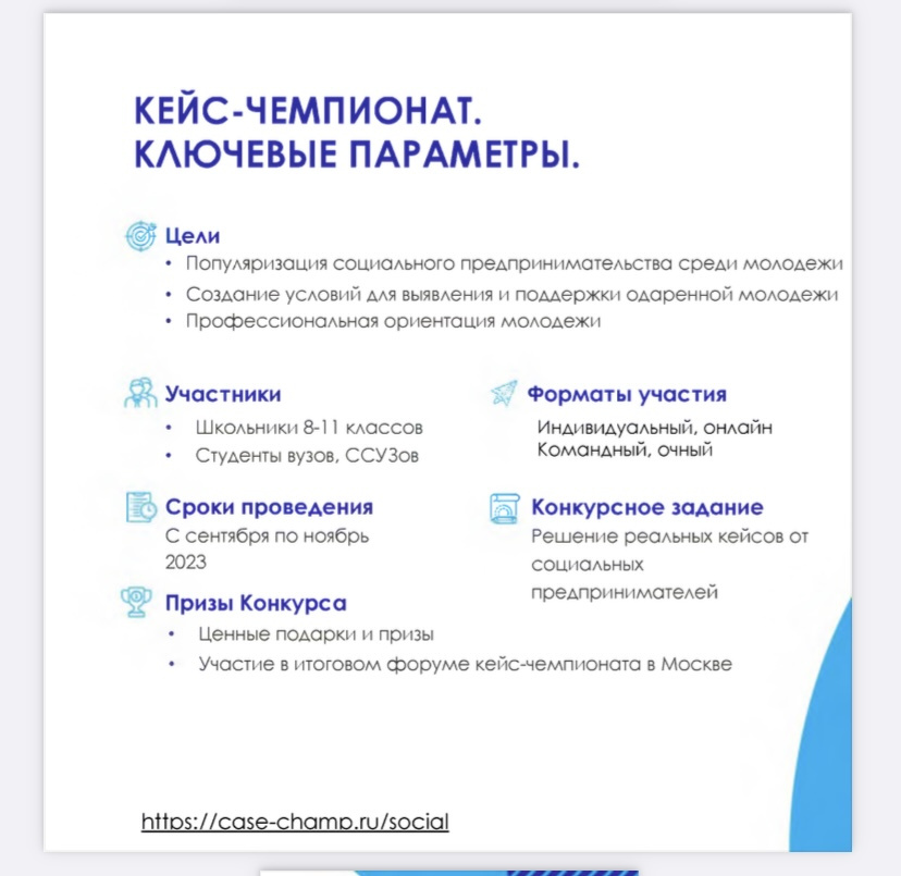Стартовал приём заявок на участие в IV Всероссийском кейс-чемпионате посоциальному предпринимательству MIR. К участию в проекте на безвозмездной основе приглашаются школьники, студенты и молодые специалисты от 14 до 35 лет.Чтобы принять участие:- подай заявку на сайте https://case-champ.ru/social- дождись письма с инструкцией- пройди онлайн курс по основам социального предпринимательства (доступоткрывается 20 сентября 2023 г.)- выполни индивидуальное задание по решению кейсов- получи приглашение на форум в Москве и поборись за крутые призы! Что получают победители?- классный мерч и подарки от организаторов и партнёров проекта- включение лучших учащихся в государственный информационный ресурсТалантыРоссии.РФ- трёхдневный форум в Москве для финалистов (проживание, питание, программа— за счёт организаторов!)- возможность пройти онлайн стажировку у партнёров проекта и получить благодарственное письмо. Проект реализуется Агентством социальных инвестиций и инноваций при поддержкеДвижения Первых. Узнать подробнее о мероприятии, а также подать заявку на участие можнона сайте проекта: case-champ.m/social.