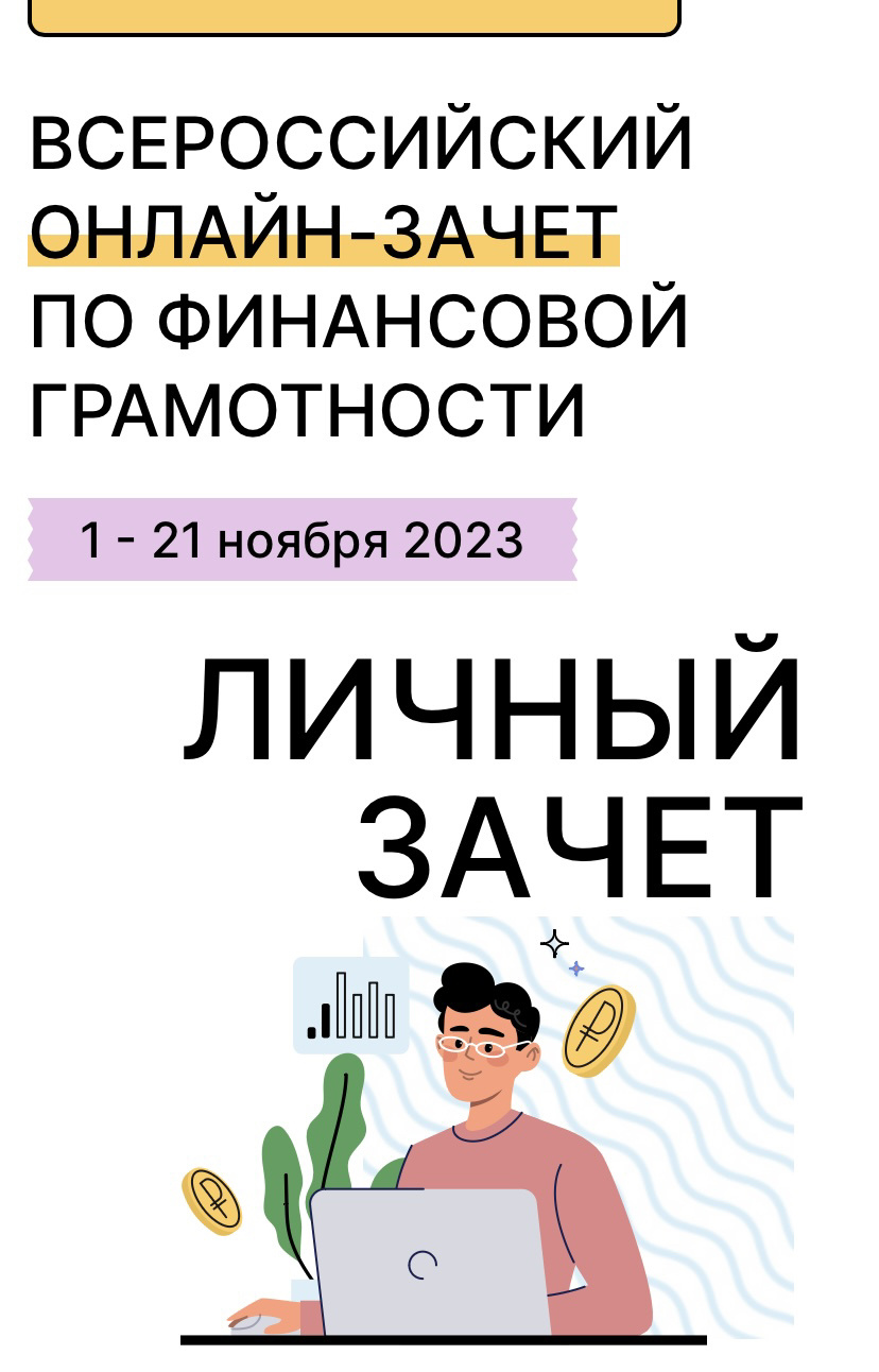 С 1 по 21 ноября 2023 года в России проходит Всероссийский онлайн-зачет по финансовой грамотности, призванный развивать творческие способности обучающихся и их родителей, расширить знания в сфере финансов, а также получить практические инструменты для принятия обоснованных финансовых решений в повседневной жизни.