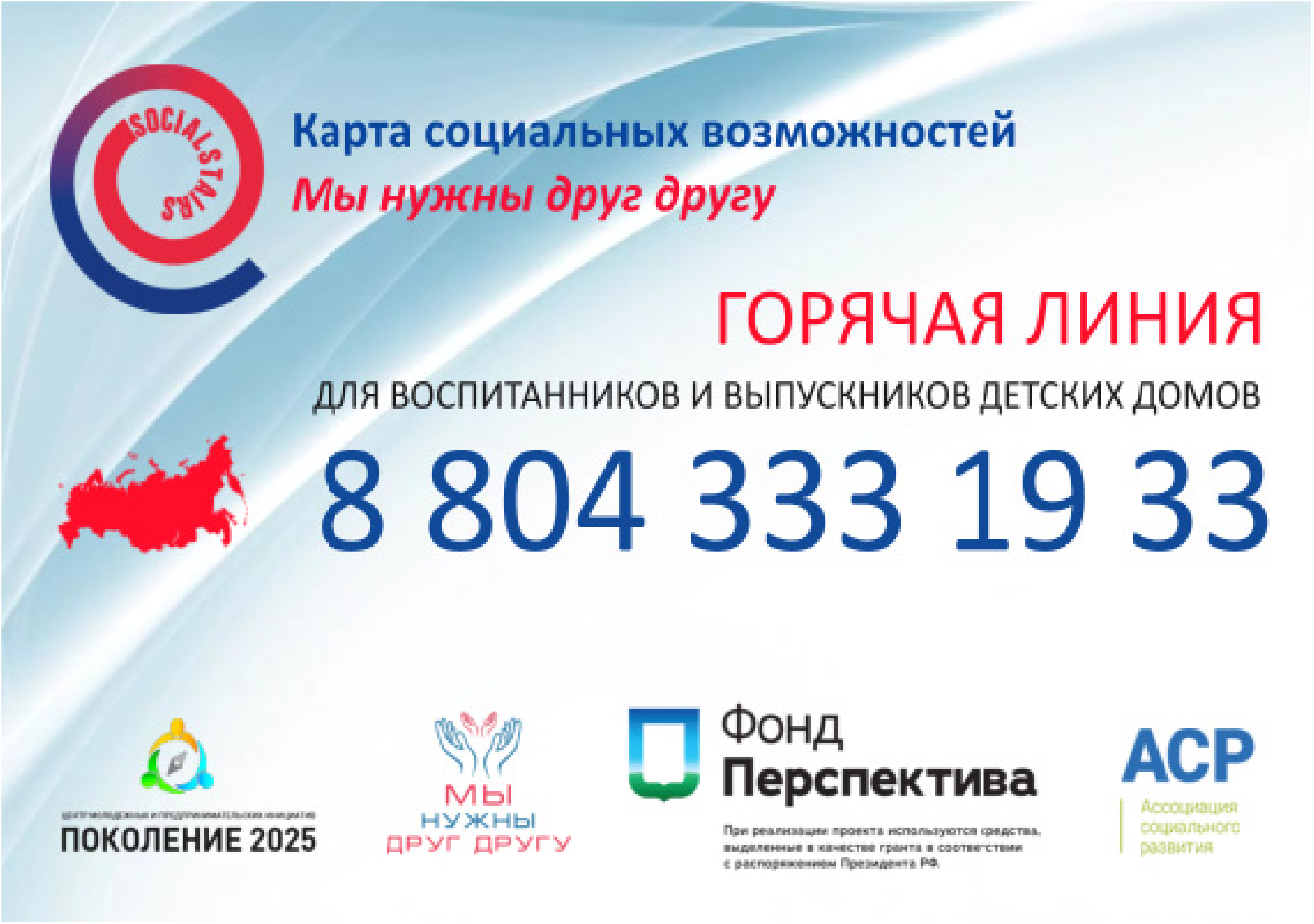 - Горячая линия 8-804-333-19-33 для выпускников и воспитанников сиротских и интернатных учреждений;
