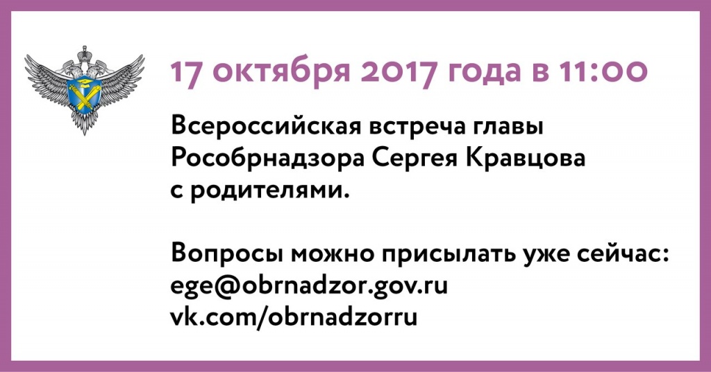 04.10.201717 октября руководитель Федеральной службы по надзору в сфере образования и науки Сергей Кравцов проведет Всероссийскую встречу с родителями.