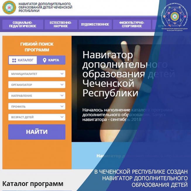 Региональный навигатор дополнительного образования детей (http://rmc-chr.ru) работает на всей территории Чеченской Республики, поэтому независимо от того, в каком муниципальном районе Вы проживаете, для записи детей на программы дополнительного обучения Вам необходимо зарегистрироваться в Навигаторе и оставить заявку на обучение. Данные о программах обновляются и дополняются в Навигаторе каждый день.