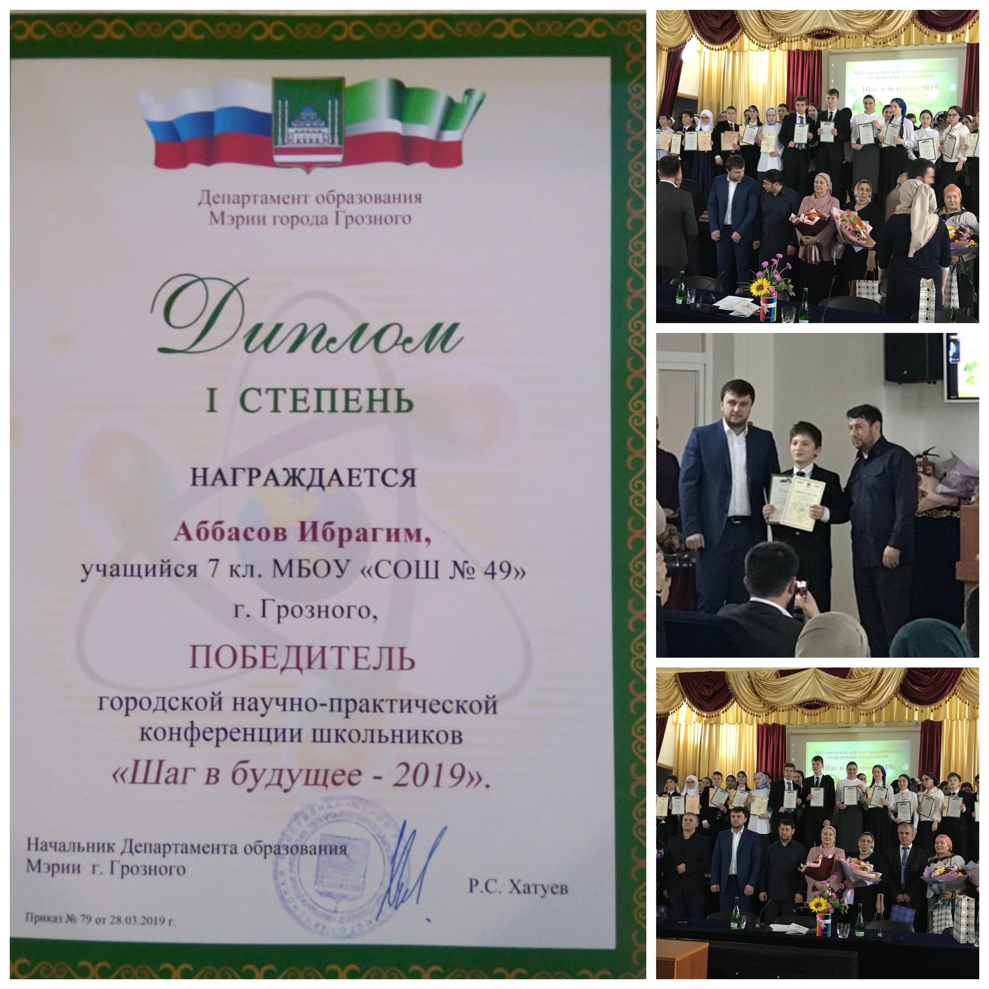 Ученик 7 "А" класса МБОУ "СОШ №49" Аббасов Ибрагим Русланович занял 1 место в XIII Городской НПК "Шаг в будущее -2019" в секции "История". Поздравляем призера и его руководителя Душаеву Хаву Юсуповну.